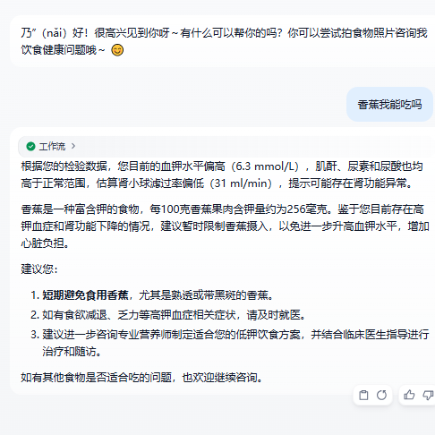 智能体团队的设计师们介绍了小墨助手最新学习的营养技能,现场拍了一张香蕉图片,小墨立刻识别出“香蕉含钾358mg/100g(满足成人日需量18%)”。当模拟患者询问“我适合吃吗?”时,系统基于健康档案给出个性化建议,并生成可视化摄入量表。最令人印象深刻的是实时交互环节——面对同学们随机提出的咖啡、坚果等饮食问题,小墨均在几秒内给出专业建议,引发阵阵惊叹。
