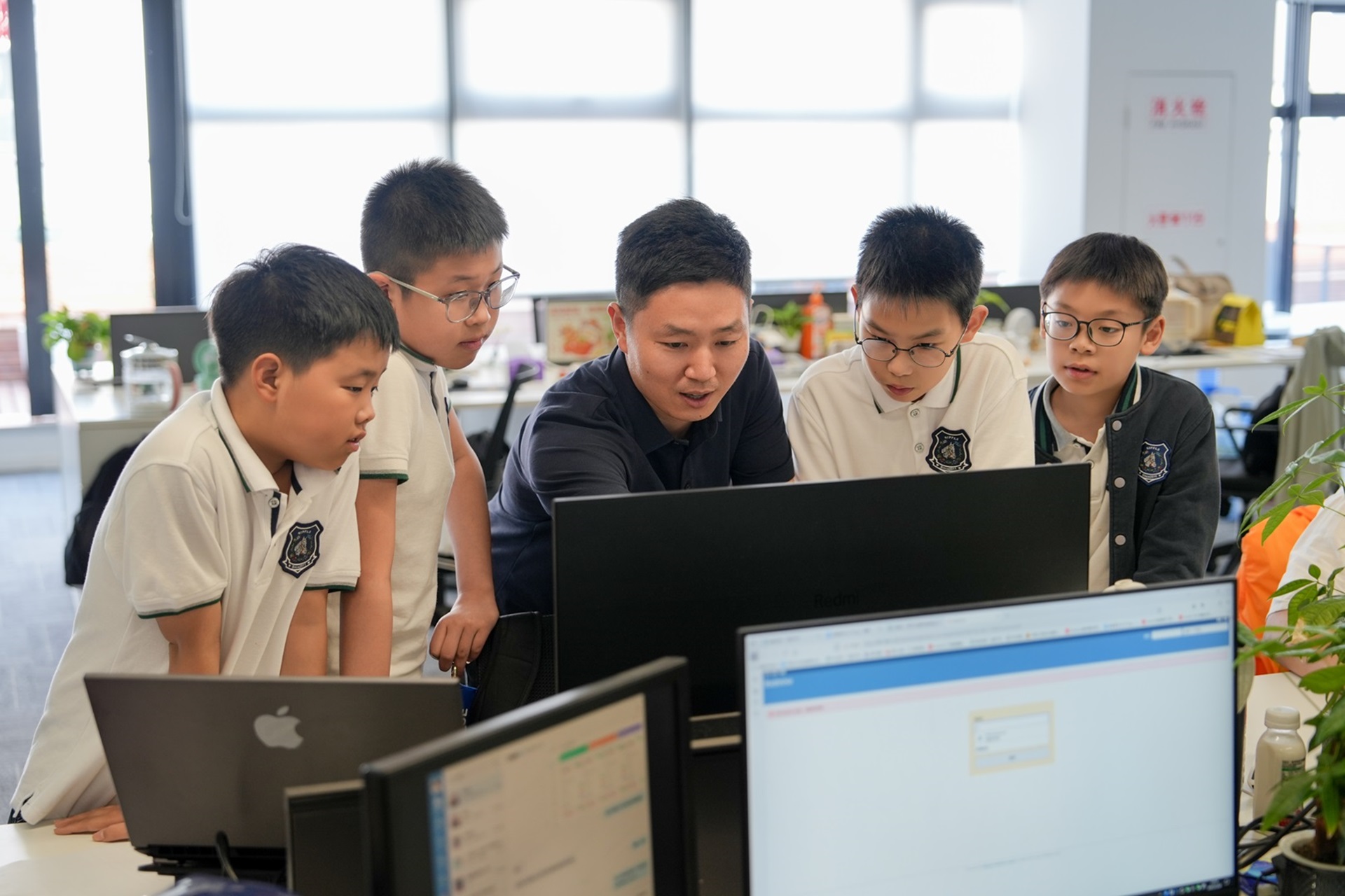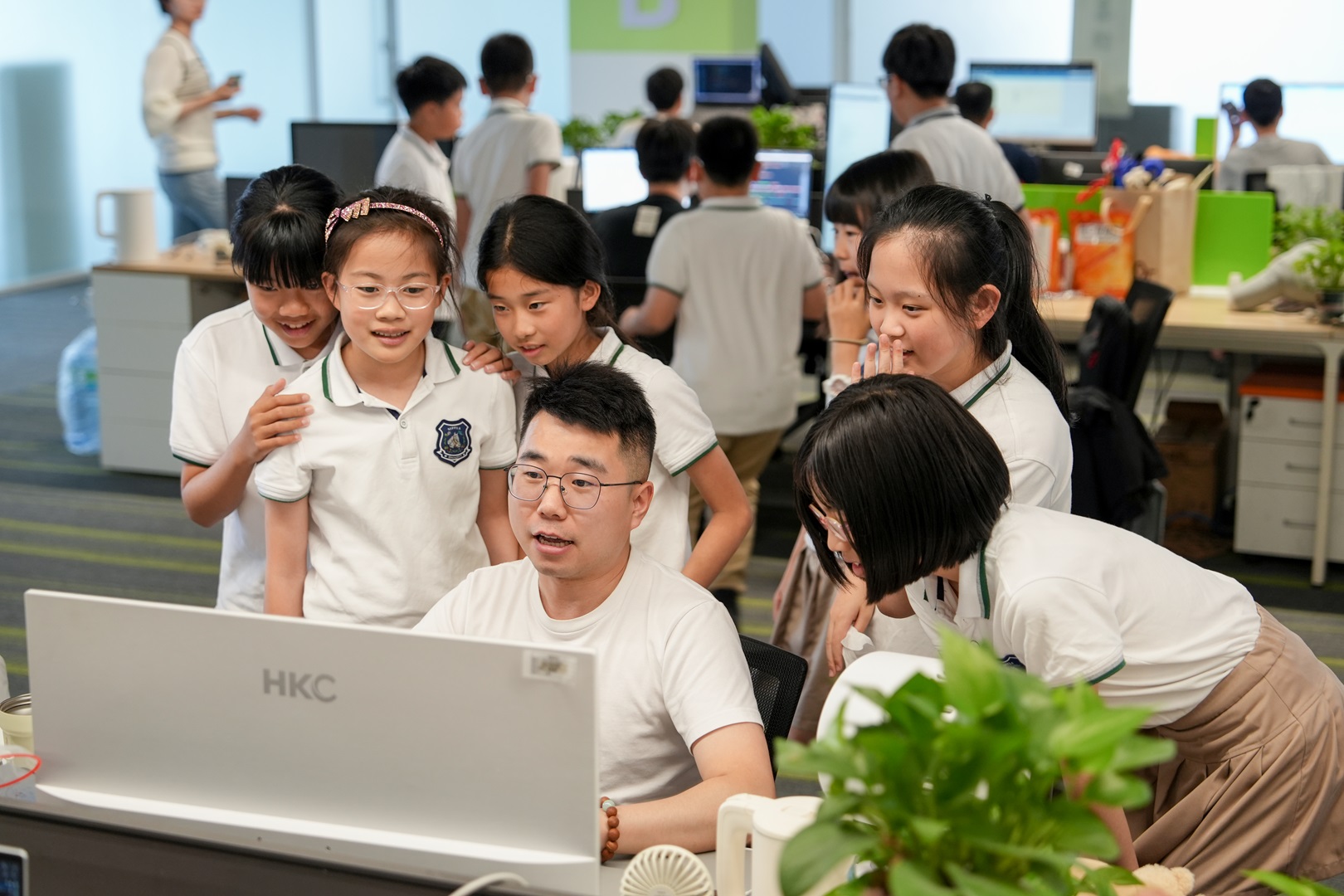互动环节将活动推向高潮。同学们化身 “好奇宝宝”,纷纷跑到感兴趣的工程师 “大哥哥”“大姐姐” 身边提问。"AI是怎么变得越来越聪明的?"、"小墨以后能帮医生看病吗?"这些充满想象力的问题让现场气氛格外热烈。面对孩子们天真的提问,工程师们用生动易懂的方式一一解答。