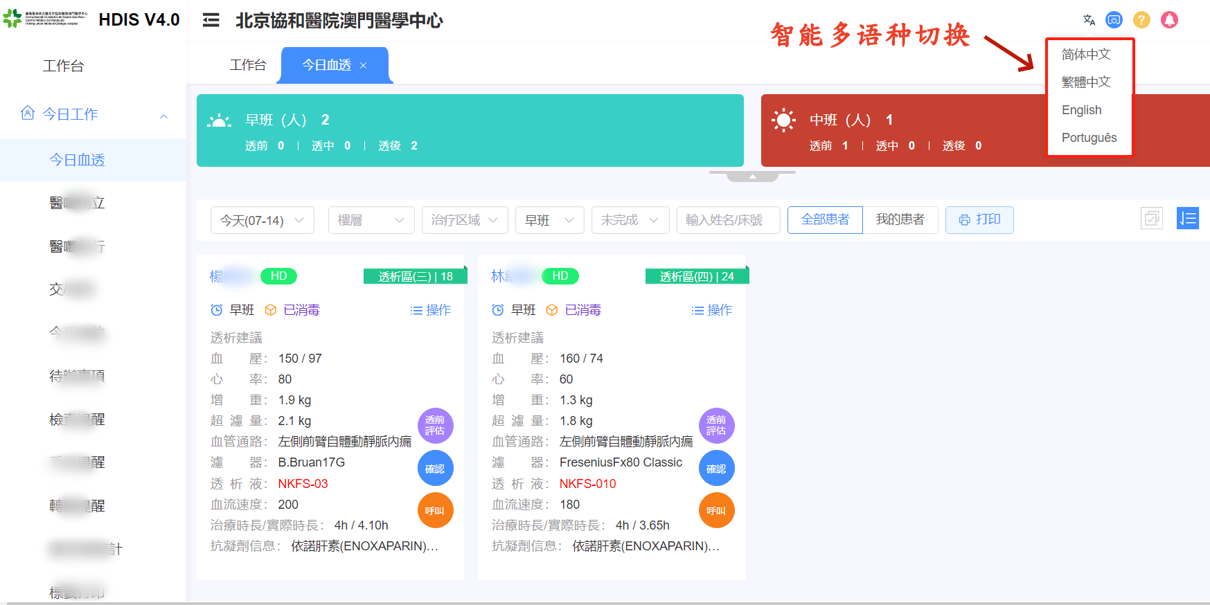 在服务澳门协和医院及开拓全球市场的实践中,华墨信息敏锐洞察到:语言,是提升医疗效率的关键一环。为真正实现“操作无国界”,华墨为血透软件量身打造了支持多语言智能切换的功能。